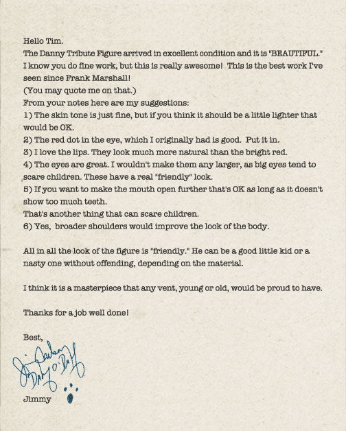 Our Danny Tribute Figure wears size 4 clothing and can be dressed right off the rack or you may order one of our special custom suits as pictured. Overall weight, fully dressed is approximately 5 pounds, due primarily to the especially lightweight materials used in the body.